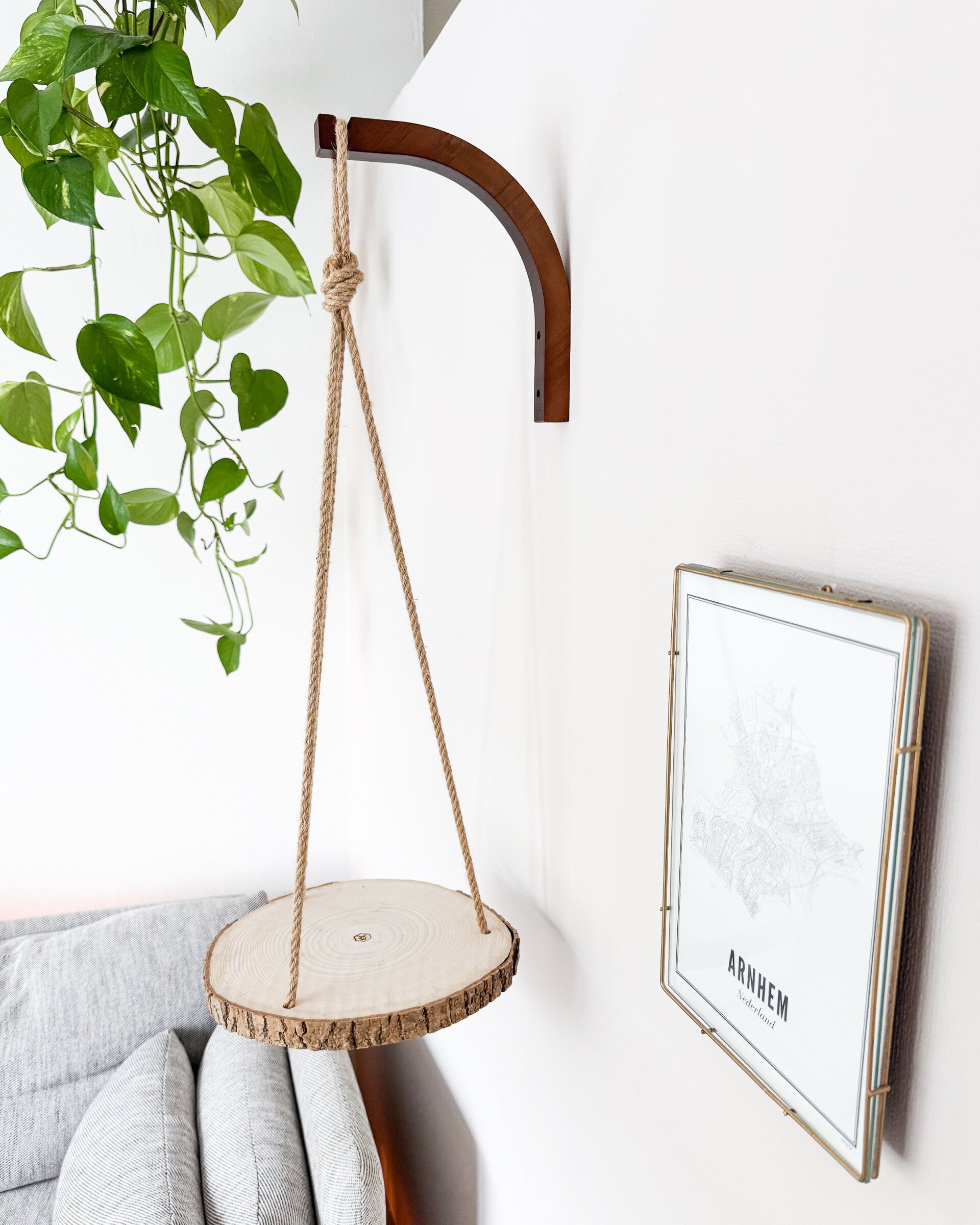 Gebogen houten wanddrager met boomstamschijf aan juten touw
